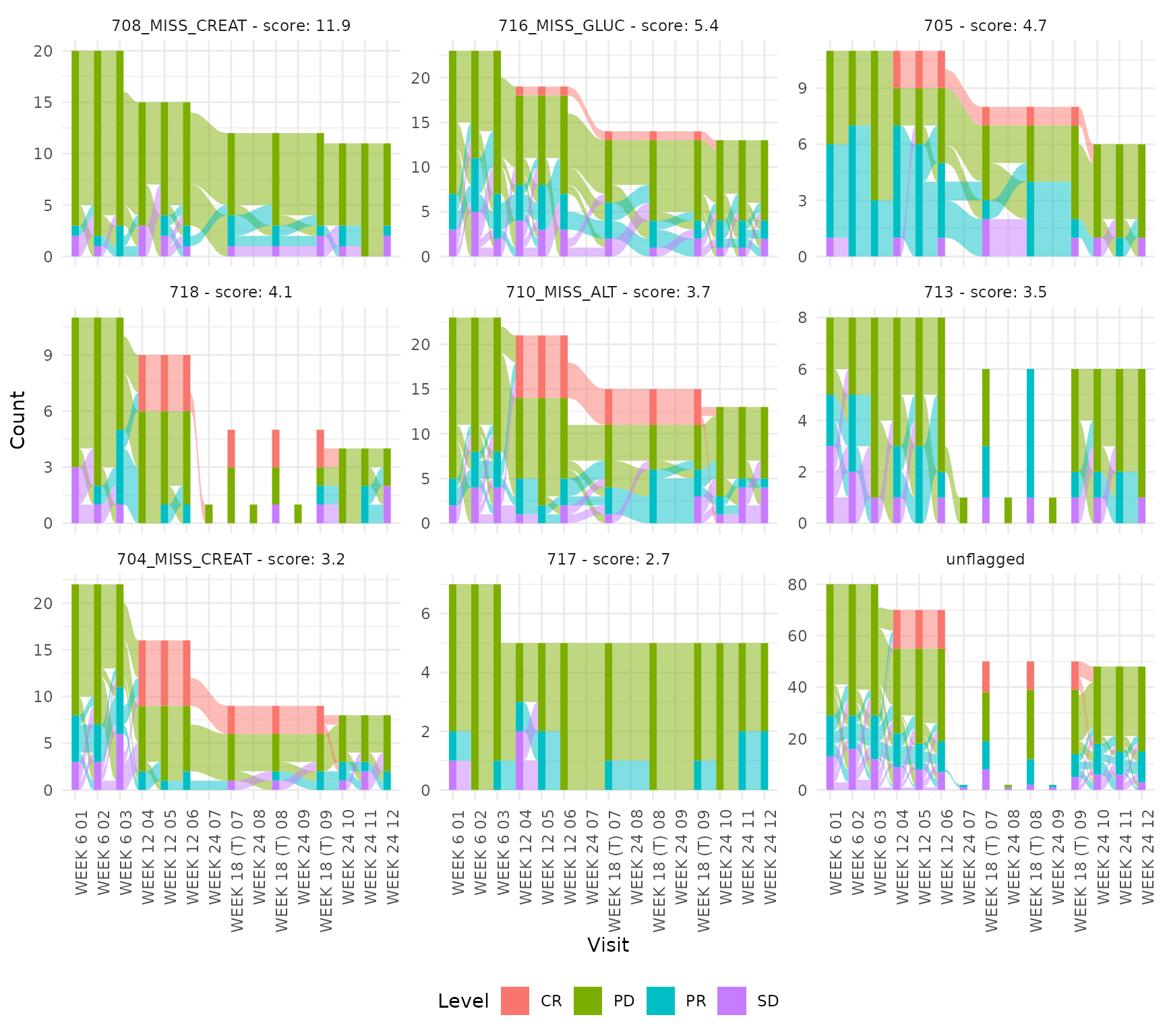 as an alluvial plot showing transitions across visits.