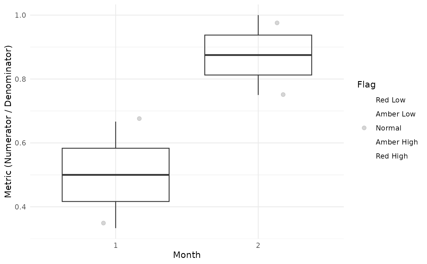 VisualizeBoxplot.RdCreates a boxplot showing the distribution of Metric values for each sequential month, with individual points colored by Flag value to highlight outliers. Points are rendered behind the boxplots with reduced opacity.